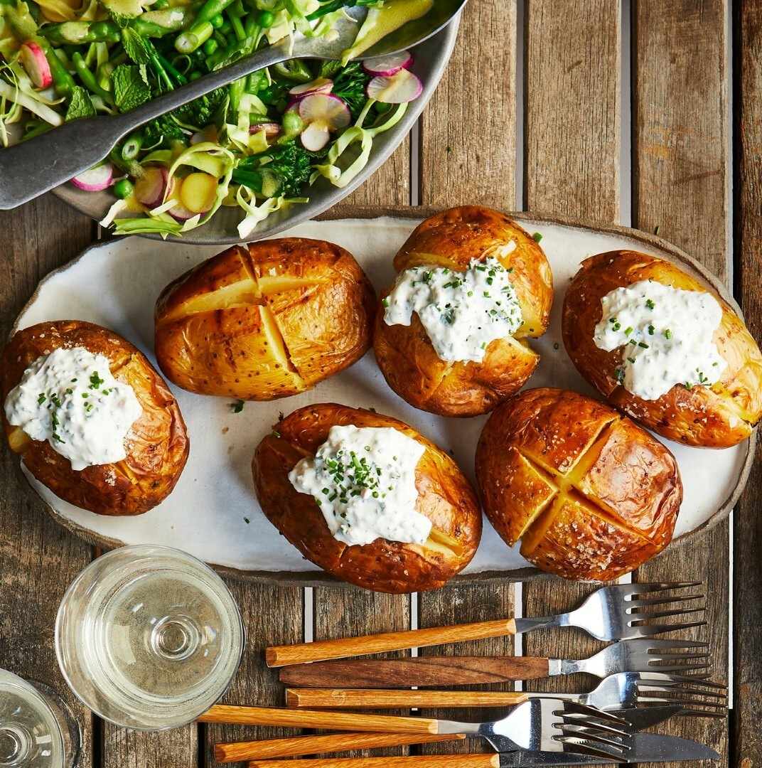 Dar karštas bulves įpjaukite kryžmai kiek mažiau nei iki pusės. Paspauskite pirštais, kad pjūvis atsivertų, dėkite kremą ir iškart patiekite.