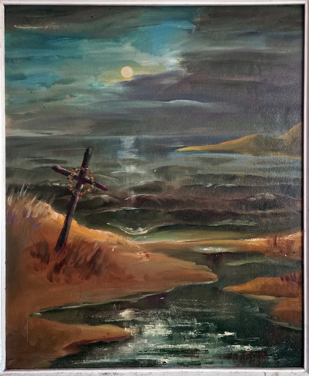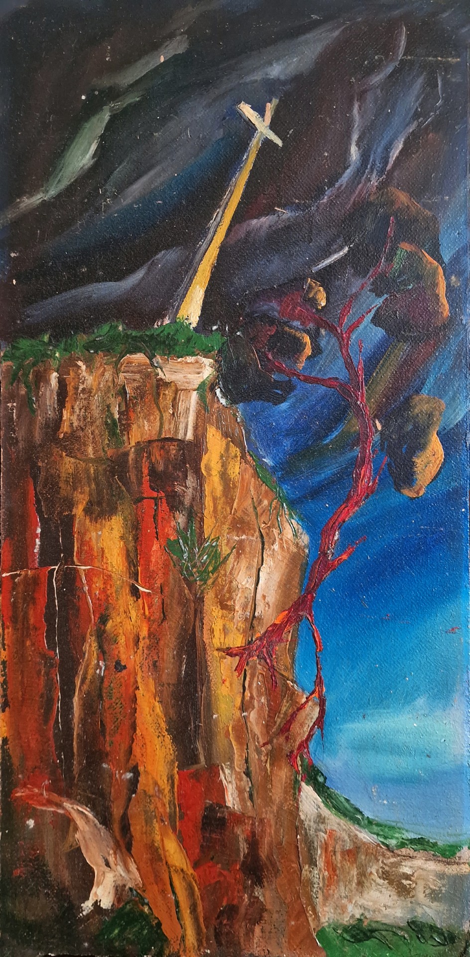Viename Atgimimo laikų paveiksle vaizduojamas ant kalno stovintis pasviręs kryžius ir nuo uolos tarsi krentantis medis. Užrašuose tapytojas ant kalno stovinčio kryžiaus simbolį įvardija trumpai – tikėjimas. Taip pavadintas ir pats paveikslas.
