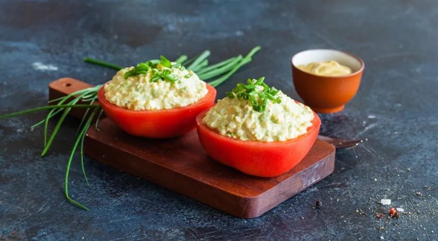 Pomidorus perpjaukite horizontaliai pusiau, šaukšteliu išskobkite sėklas. Į kiekvieną puselę įdėję kiaušinių salotų, pagardinkite druska bei pipirais ir pabarstykite smulkintais laiškiniais česnakais.