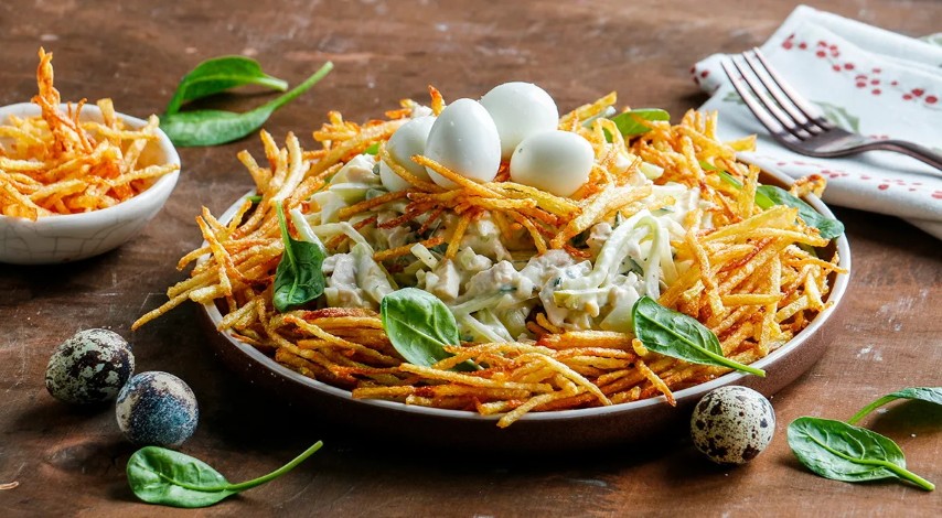 Reikės (4 porcijoms): 400 g vištienos filė, 4 virtų (10 minučių) vištų kiaušinių, 4–5 virtų (5 minutes) putpelių kiaušinių, 150 g svogūnų, 250 g marinuotų arba šviežių agurkų, 2 petražolių šakelių (galima pakeisti krapais ar net kalendromis), 400 g bulvių, aliejaus gruzdintuvei, 150–200 g majonezo, salotų lapų, druskos, šviežiai maltų juodųjų pipirų.